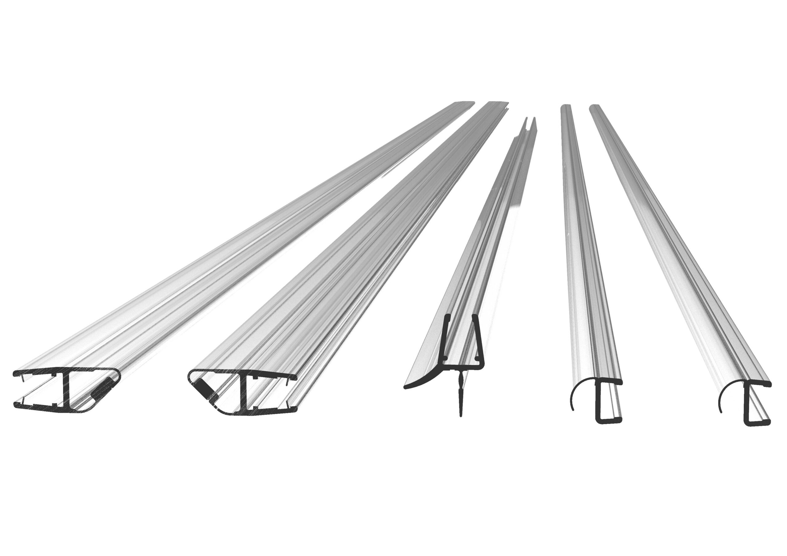 Dieses Set ist geeignet für vierteilige Eckeinstiege mit zwei Drehtüren an jeweils einem Festteil. Es enthält fünf transparente Dichtungen aus hochwertigem Kunststoff, die zugeschnitten werden müssen. Die Dichtungen werden werkzeuglos auf die Glaskanten aufgesteckt.